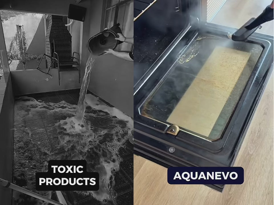 Aquanevo transforms water into superheated steam (115 °C) to dissolve grease, eliminate bacteria, and disinfect, all without using any chemicals.